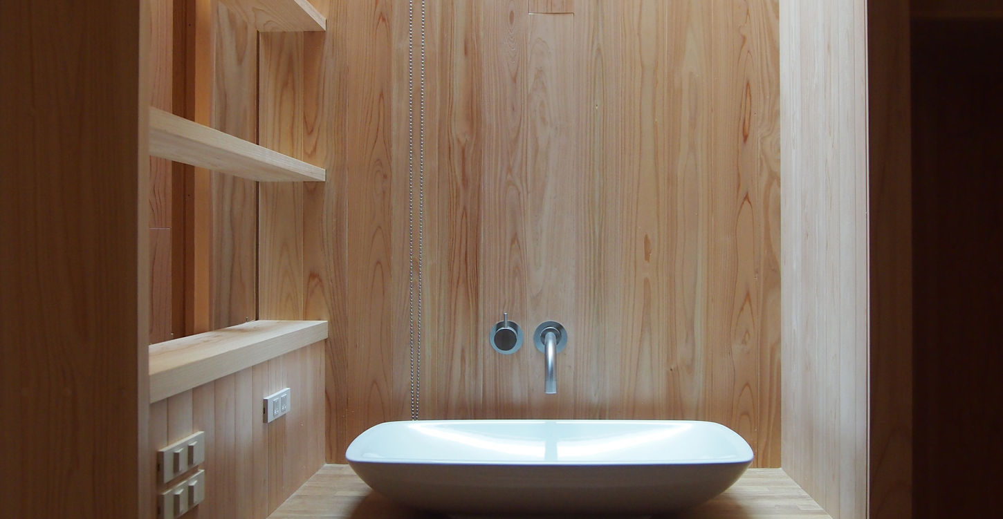 家族4人とネコ2匹のための木造2階建て住宅。コンパクトに納めたプランの各処に家人や猫の居場所がある。製材所直送の杉材を構造材や仕上げ材に豊富に使用し、温かみのある空間となっている。